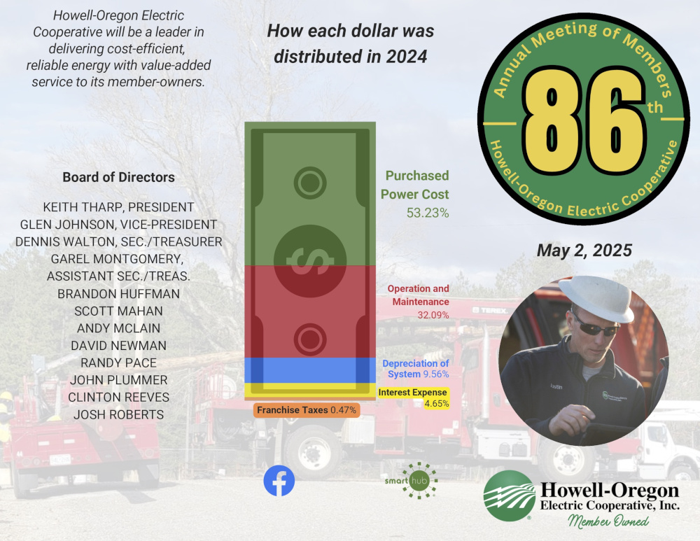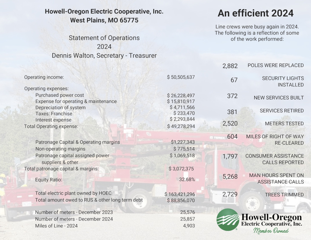 At each Annual Meeting of Membership, information is shared with HOEC members about the operation of the Cooperative, including system improvements and the challenges and expenses of the past year. Below is the Statement of Operations from 2024, with information shared at the 2025 annual meeting.