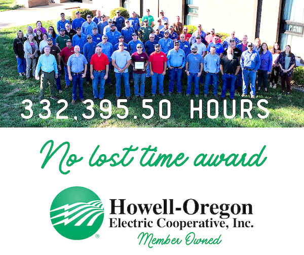 Howell-Oregon Electric Cooperative (HOEC), West Plains, was one of 35 Missouri electric cooperatives recognized for working safely. Employees of the cooperative have now worked a total of 332,395.50 hours without a lost time accident.