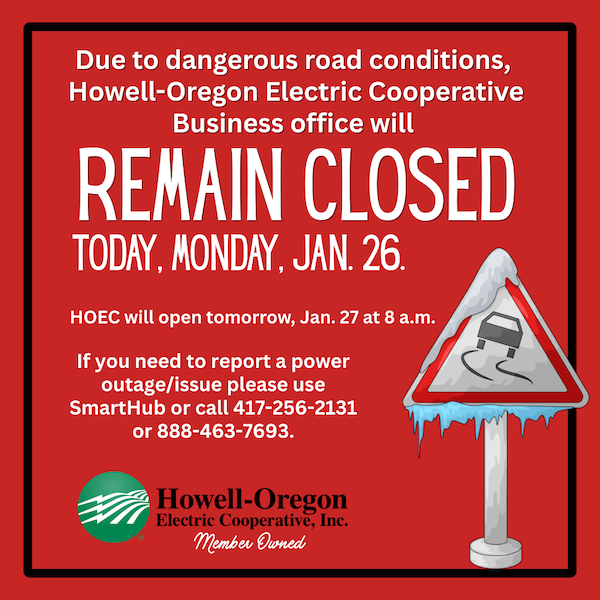 The HOEC business office will be CLOSED today, Monday, January 26, due to the poor road conditions for the safety of our employees. If you need to report a power outage, you can use SmartHub through the link at the top of this website, or the SmartHub Mobile App, or you can call 417-256-2131. The business office will open Tuesday morning at 8am as usual.