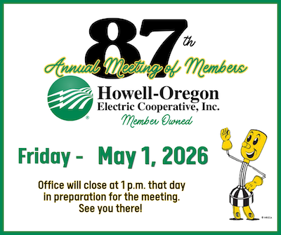 HOEC will host its 87th Annual Meeting at West Plains Civic Center on Friday, May 1, 2026. The office will close at 1:00 pm. Then at the Civic Center doors will open at 4:30 pm. Food and entertainment start at 5:00 pm, with displays, attendance gifts, and prizes, as well as the Kids Zone.