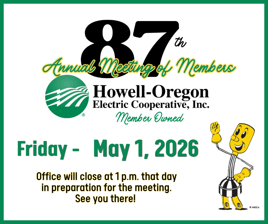 HOEC will host its 87th Annual Meeting at West Plains Civic Center on Friday, May 1, 2026. The office will close at 1:00 pm. Then at the Civic Center doors will open at 4:30 pm. Food and entertainment start at 5:00 pm, with displays, attendance gifts, and prizes, as well as the Kids Zone.
